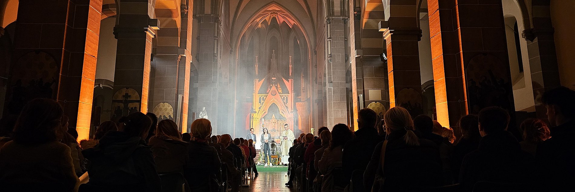 Klassische Choräle treffen auf moderne geistliche Songs, das Spiel von Licht und Schatten prägt den Kirchenraum.