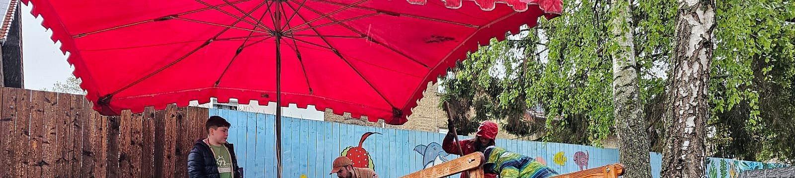 Ebenso wurden die Hochbeete renoviert und neu bepflanzt. Zusätzlich haben die jungen Erwachsenen eine neue Matschküche und eine Tankstelle für die Kinder gebaut.